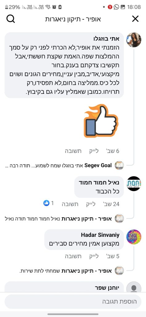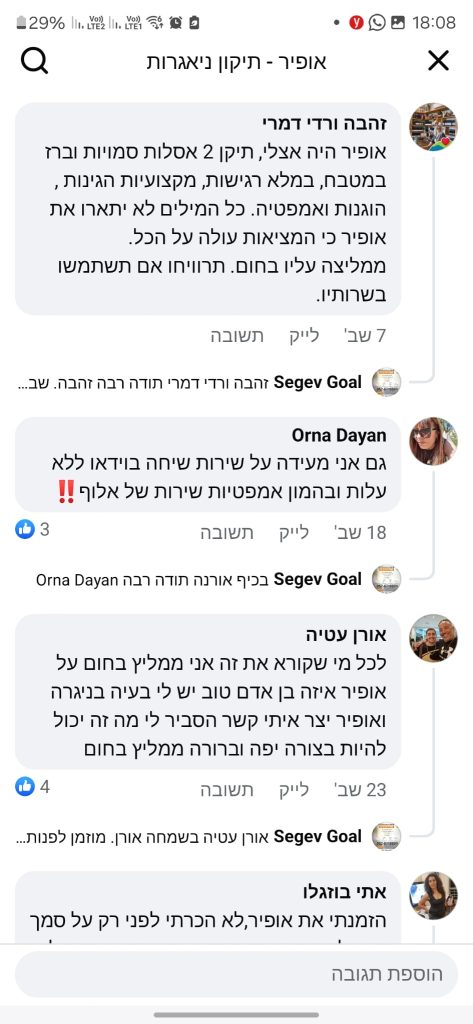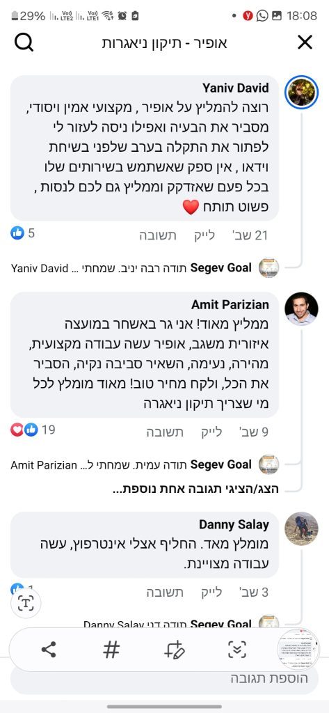 "אם אתם מחפשים מקצוען אמיתי, אופיר מניאגרה פיקס הוא הכתובת. הייתה לנו תקלה רצינית בניאגרה, והוא לא רק תיקן אותה במהירות, אלא גם הסביר בסבלנות כל שלב בתהליך. שירות מעולה במחיר הוגן – תודה לך, אופיר!"